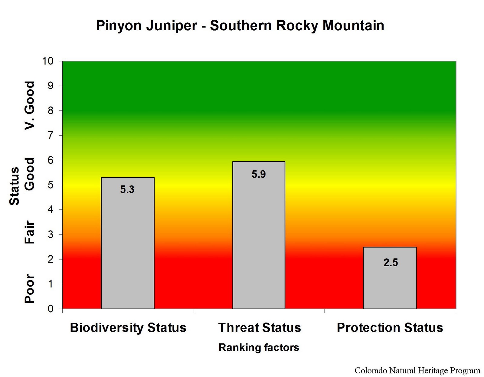 Southern Rocky Mountain pinyon-juniper covers some 1.25 million acres in Colorado. Ownership is divided about equally between private and public ownership, with the Bureau of Land Management responsible for the majority of federal holdings. Pinyon-juniper ecological systems have declined in both extent and quality compared to historic norms, although there are a number of very large patches remaining. Threats include urban development, recreation (especially motorized recreation), invasive species (most notably an increase in cheatgrass in the understory, which has led to increasing fire ignitions), and energy development.